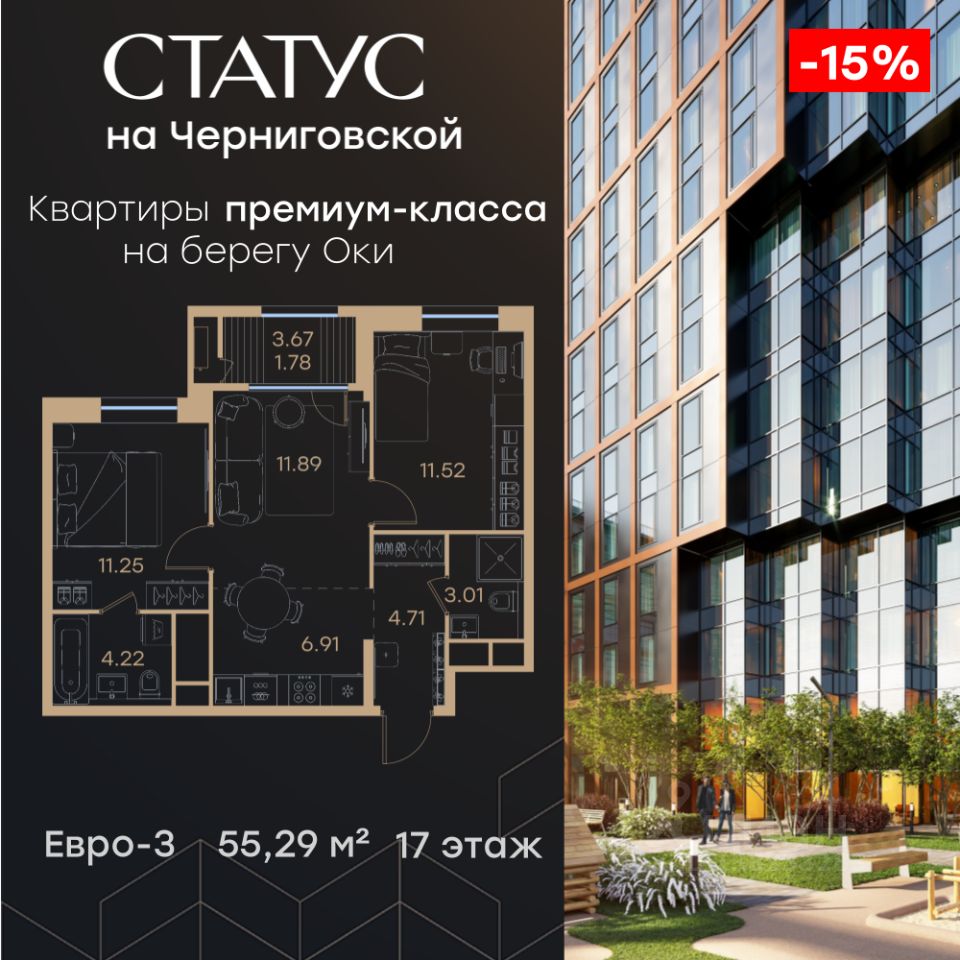 55 м² · Этаж 17 из 32