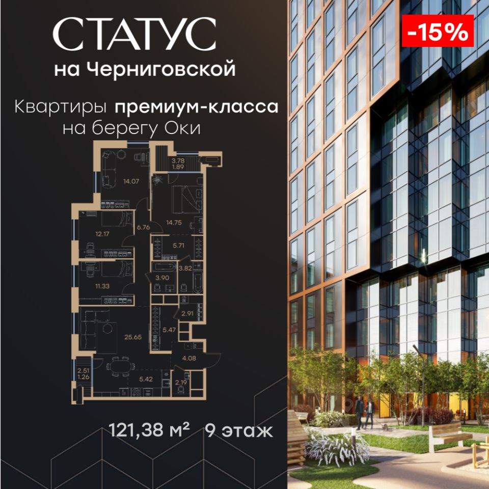 Продается 4-комн. квартира на 9-м этаже в строящемся проекте премиум-класса СТАТУС на Черниговской. Общая площадь лота составляет 121,38 кв. м, из которых 52,32 кв. м отведено под жилую и 5,42 кв. м под кухонную зону. Номер квартиры - 55. Преимущества квартиры: - Квартиры премиум-класса у воды - Первая береговая линия. Изумительные виды на Стрелку и слияние Оки и Волги - Панорамные окна во всех квартирах - 11 минут до Кремля, 5 мин до Нижневолжской набережной - Дизайнерские лобби со вторым светом - Двухуровневый отапливаемый паркинг на 350 м\м - Приватный благоустроенный двор с видеонаблюдением только для резидентов - Современные детские площадки, зоны спокойного отдыха, зона для занятия спортом, зеленые кабинеты на свежем воздухе - Детские сады и школы в шаговой доступности - Собственный комьюнити-центр с коворкингом, детской комнатой, залом для фитнеса и кофе-поинтом. - Умный Дом и Умная Квартира - Ресторанный кластер в ЖК - Келлеры для хранения - Коммерческие помещения на 1 этаже СТАТУС на Черниговской - новый жилой комплекс премиум класса в историческом центре Нижнего Новгорода, в котором объединились лаконичность архитектурной мысли, технологичность решений и внимание к деталям, присущее всем проектам компании GloraX. Проект для рационалистов, придающих большое внимание собственному комфорту и современным технологиям СТАТУС на Черниговской - это высшая форма Нижнего Новгорода. Инновационные решения и сервисы, закрытые дворы в стилобате с уютными детскими площадками, гастро-кластер, комьюнити-центр и дизайнерские лобби здесь все создано для максимального комфорта каждого жителя. Приватное пространство внутреннего двора с тактильными тропами, с собственным садами, камерными зелеными кабинетами для работы и отдыха, детскими площадками для разных возрастов и местами для занятия спортом создает неповторимую атмосферу безмятежности и спокойствия. СТАТУС на Черниговской возвращает набережной и пространству вокруг исторический статус, привлекая тех, кто готов развиваться вместе с городом. Дорога до любимейшего променада нижегородцев Нижневолжской набережной займет всего 10 минут пешком, до ближайшей станции метро Горьковская 10 минут на автомобиле. Попасть на главную площадь города, Чкаловскую лестницу и в Кремль на машине за 11 мин? Легко! И всего 48 минут займет путь до международного аэропорта имени Чкалова, что станет неоспоримым преимуществом для тех, кто часто летает в командировки. В проекте СТАТУС на Черниговской доступен широкий выбор планировочных решений от небольших уютных студий площадью 28,3 м2 до двухуровневых квартир с террасами площадью до 188,7 м2 и потрясающими видами на Нижегородские закаты. Получить ключи и сразу переехать? Легко! Мы подготовили для вас чистовую отделку в двух стилях: в эко- минималистичном светлом и своременно-модернистском темном. Отдельной опцией можно даже дозаказать покраску стен в 4 трендовых цветах на выбор: агатовый серый, серебристо-серый, серый шелк и тонкий лен. Цена указана при 100% опл