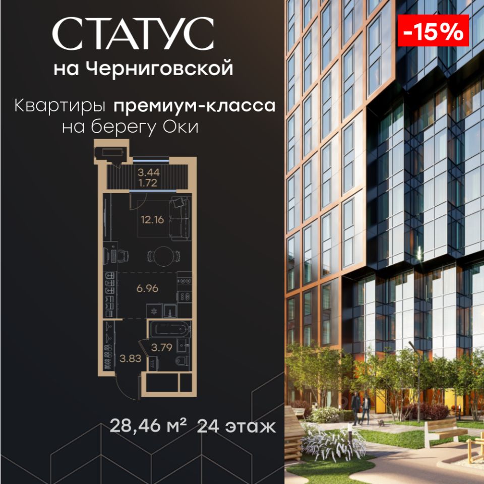 Продается квартира-студия на 24-м этаже в строящемся проекте премиум-класса СТАТУС на Черниговской. Общая площадь лота составляет 28,46 кв. м, из которых 12,16 кв. м отведено под жилую и кв. м под кухонную зону. Номер квартиры - 207. Преимущества квартиры: - Квартиры премиум-класса у воды - Первая береговая линия. Изумительные виды на Стрелку и слияние Оки и Волги - Панорамные окна во всех квартирах - 11 минут до Кремля, 5 мин до Нижневолжской набережной - Дизайнерские лобби со вторым светом - Двухуровневый отапливаемый паркинг на 350 м\м - Приватный благоустроенный двор с видеонаблюдением только для резидентов - Современные детские площадки, зоны спокойного отдыха, зона для занятия спортом, зеленые кабинеты на свежем воздухе - Детские сады и школы в шаговой доступности - Собственный комьюнити-центр с коворкингом, детской комнатой, залом для фитнеса и кофе-поинтом. - Умный Дом и Умная Квартира - Ресторанный кластер в ЖК - Келлеры для хранения - Коммерческие помещения на 1 этаже СТАТУС на Черниговской - новый жилой комплекс премиум класса в историческом центре Нижнего Новгорода, в котором объединились лаконичность архитектурной мысли, технологичность решений и внимание к деталям, присущее всем проектам компании GloraX. Проект для рационалистов, придающих большое внимание собственному комфорту и современным технологиям СТАТУС на Черниговской - это высшая форма Нижнего Новгорода. Инновационные решения и сервисы, закрытые дворы в стилобате с уютными детскими площадками, гастро-кластер, комьюнити-центр и дизайнерские лобби здесь все создано для максимального комфорта каждого жителя. Приватное пространство внутреннего двора с тактильными тропами, с собственным садами, камерными зелеными кабинетами для работы и отдыха, детскими площадками для разных возрастов и местами для занятия спортом создает неповторимую атмосферу безмятежности и спокойствия. СТАТУС на Черниговской возвращает набережной и пространству вокруг исторический статус, привлекая тех, кто готов развиваться вместе с городом. Дорога до любимейшего променада нижегородцев Нижневолжской набережной займет всего 10 минут пешком, до ближайшей станции метро Горьковская 10 минут на автомобиле. Попасть на главную площадь города, Чкаловскую лестницу и в Кремль на машине за 11 мин? Легко! И всего 48 минут займет путь до международного аэропорта имени Чкалова, что станет неоспоримым преимуществом для тех, кто часто летает в командировки. В проекте СТАТУС на Черниговской доступен широкий выбор планировочных решений от небольших уютных студий площадью 28,3 м2 до двухуровневых квартир с террасами площадью до 188,7 м2 и потрясающими видами на Нижегородские закаты. Получить ключи и сразу переехать? Легко! Мы подготовили для вас чистовую отделку в двух стилях: в эко- минималистичном светлом и своременно-модернистском темном. Отдельной опцией можно даже дозаказать покраску стен в 4 трендовых цветах на выбор: агатовый серый, серебристо-серый, серый шелк и тонкий лен. Цена указана при 100% оплате и