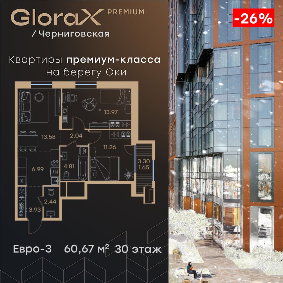 Продается 2-комн. квартира на 30-м этаже в строящемся проекте премиум-класса GloraX Premium Черниговская. Общая площадь лота составляет 60,67 кв. м, из которых 25,23 кв. м отведено под жилую и 20,57 кв. м под кухонную зону. Номер квартиры - 555. Преимущества квартиры: - Квартиры премиум-класса у воды - Первая береговая линия. Изумительные виды на Стрелку и слияние Оки и Волги - Панорамные окна во всех квартирах - 11 минут до Кремля, 5 мин до Нижневолжской набережной - Дизайнерские лобби со вторым светом - Двухуровневый отапливаемый паркинг на 350 м\м - Приватный благоустроенный двор с видеонаблюдением только для резидентов - Современные детские площадки, зоны спокойного отдыха, зона для занятия спортом, зеленые кабинеты на свежем воздухе - Детские сады и школы в шаговой доступности - Собственный комьюнити-центр с коворкингом, детской комнатой, залом для фитнеса и кофе-поинтом. - Умный Дом и Умная Квартира - Ресторанный кластер в ЖК - Келлеры для хранения - Коммерческие помещения на 1 этаже GloraX Premium Черниговская - новый жилой комплекс премиум класса в историческом центре Нижнего Новгорода, в котором объединились лаконичность архитектурной мысли, технологичность решений и внимание к деталям, присущее всем проектам компании GloraX. Проект для рационалистов, придающих большое внимание собственному комфорту и современным технологиям GloraX Premium Черниговская это высшая форма Нижнего Новгорода. Инновационные решения и сервисы, закрытые дворы в стилобате с уютными детскими площадками, гастро-кластер, комьюнити-центр и дизайнерские лобби здесь все создано для максимального комфорта каждого жителя. Приватное пространство внутреннего двора с тактильными тропами, с собственным садами, камерными зелеными кабинетами для работы и отдыха, детскими площадками для разных возрастов и местами для занятия спортом создает неповторимую атмосферу безмятежности и спокойствия. GloraX Premium Черниговская возвращает набережной и пространству вокруг исторический статус, привлекая тех, кто готов развиваться вместе с городом. Дорога до любимейшего променада нижегородцев Нижневолжской набережной займет всего 10 минут пешком, до ближайшей станции метро Горьковская 10 минут на автомобиле. Попасть на главную площадь города, Чкаловскую лестницу и в Кремль на машине за 11 мин? Легко! И всего 48 минут займет путь до международного аэропорта имени Чкалова, что станет неоспоримым преимуществом для тех, кто часто летает в командировки. В GloraX Premium Черниговская доступен широкий выбор планировочных решений от небольших уютных студий площадью 28,3 м2 до двухуровневых квартир с террасами площадью до 188,7 м2 и потрясающими видами на Нижегородские закаты. Получить ключи и сразу переехать? Легко! Мы подготовили для вас чистовую отделку в двух стилях: в эко- минималистичном светлом и своременно-модернистском темном. Отдельной опцией можно даже дозаказать покраску стен в 4 трендовых цветах на выбор: агатовый серый, серебристо-серый, серый шелк и тонкий лен. Цена ука