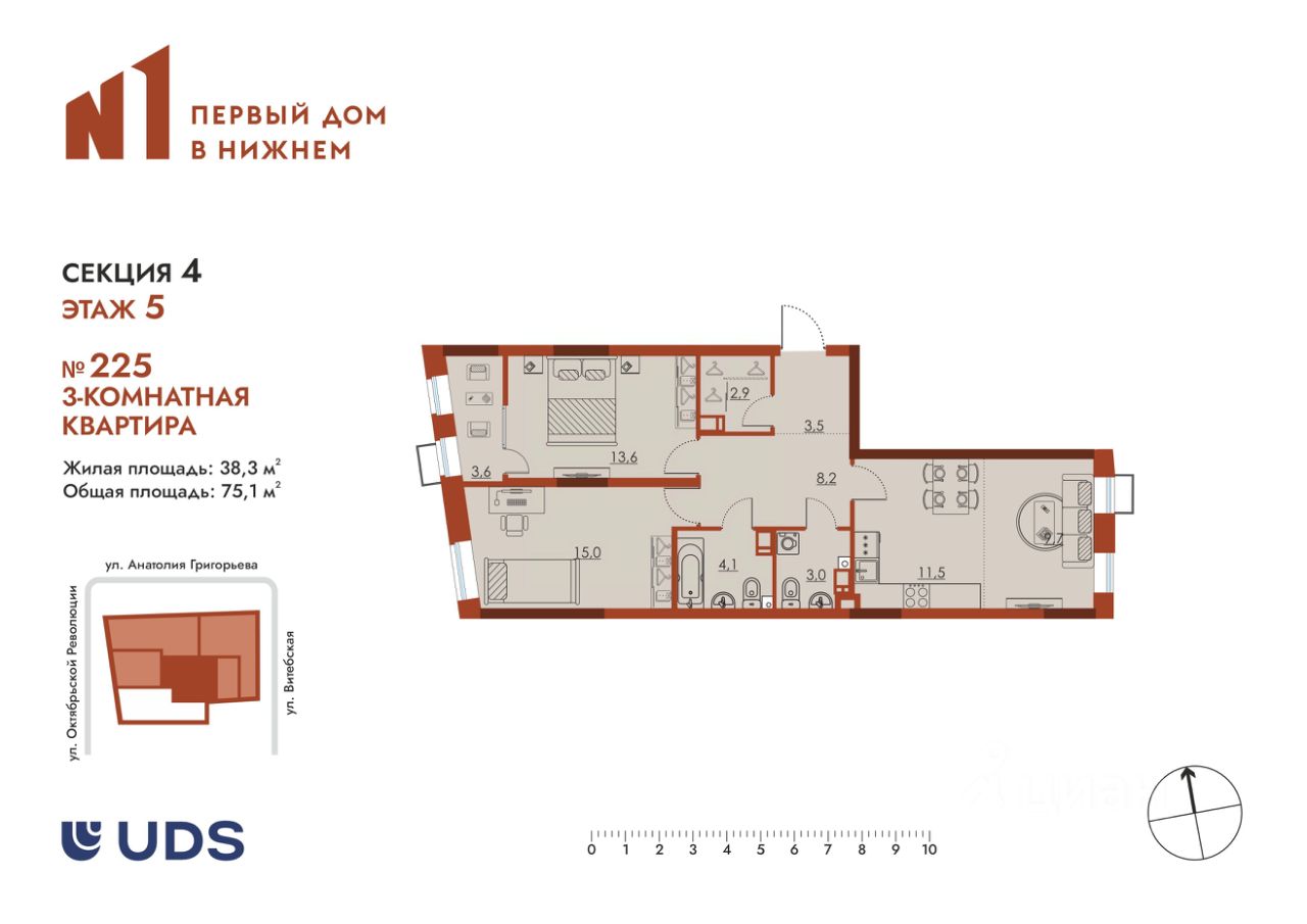 Просторная 3-комнатная квартира в ''N1 Первый дом в Нижнем'' — для тех, кто ценит продуманный комфорт Современная планировка 75,1 м²: — Отдельная зона для верхней одежды и обуви, чтобы в доме всегда было чисто— никакой уличной пыли в жилом пространстве. — 2 санузла, в одном поместится полноценная ванна. — Гардеробная в прихожей для идеального порядка. Свет и комфорт: — Окна на две стороны света — солнце целый день! — 2 окна в кухне-гостиной — простор и ощущение свободы. — Тёплая лоджия — место для утреннего кофе или вечернего отдыха. Детали для жизни: — 2 корзины под кондиционеры — климат-контроль без лишних проводов. — Место для рабочего стола — легко организовать кабинет. Отличное расположение: — Рядом улицы Анатолия Григорьева, Винтовая, Октябрьской Революции — вся инфраструктура под рукой. Это не просто квартира — это дом, где каждая деталь продумана для вашего удобства! Звоните или пишите в чат, чтобы увидеть и захотеть остаться!