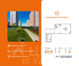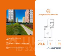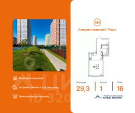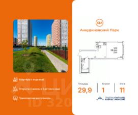 Продаётся 1-комнатная квартира в строящемся доме (53), срок сдачи: III-кв. 2027, общей площадью 29.9 кв.м., на 14 этаже. Расположение, транспортная доступность Жилой комплекс ''КМ Анкудиновский парк'' - это микрорайон, в состав которого входит 27 монолитно-кирпичных домов эконом-класса высотой 19-35 этажей, а также разнообразная инфраструктура. Жилой массив размещается на территории площадью 50 гектаров. Комплекс находится за пределами Нижнего Новгорода, в Кстовском районе, около деревни Анкудиновка. Город рядом - до него всего 6 километров. Без пробок до центральной части Нижнего Новгорода от комплекса можно добраться всего за двадцать минут. Поблизости находится улица Ларина, по которой можно быстро выехать на проспект Гагарина, ведущий в центр города. Специально для улучшения транспортной ситуации застройщик организовал рядом с корпусами микрорайона автобусные остановки, поэтому добраться до города можно будет быстро и тем, кто не пользуется личным автотранспортом. В десяти минутах ходьбы от комплекса находится железнодорожная платформа ''Анкудиновка'', от которой можно за час с небольшим доехать до Московского вокзала Нижнего Новгорода. Инфраструктура Собственная инфраструктура микрорайона ''КМ Анкудиновский парк'' включает в себя: несколько детских садов, общеобразовательную школу, бизнес-центр, торговый и физкультурно-оздоровительный комплексы. На первых этажах зданий располагаются офисные и коммерческие помещения. В посёлке Анкудиновка инфраструктуры не очень много, но в деревне Федяково (до которой от новостройки можно доехать за десять минут) работает крупный торговый центр ''Мега'' с гипермаркетами ''Ашан'', IKEA и OBI. По улице Ларина можно быстро доехать до центральной части Нижнего Новгорода, где расположено большое количество магазинов и торговых центров. Одно из главных достоинств ЖК ''КМ Анкудиновский парк'' - это экологичность места, в котором он располагается. По соседству находится огромный Анкудиновский парк (в честь которого назван комплекс) и Ботанический сад, где собрано множество редких растений (с мая по октябрь в саду работает Дендрарий с тропическими и субтропическими растениями). Недалеко располагается несколько лесных озёр и лесопарк ''Щёлковский хутор'', на территории которого есть Музей архитектуры и быта народов нижегородского Поволжья. Все крупные транспортные магистрали находятся на безопасном для качества воздуха расстоянии от микрорайона. У жителей ''Анкудиновского парка'' есть уникальная возможность жить за городом, в хороших экологических условиях, на свежем воздухе, и, в то же время, рядом с городом и всей необходимой инфраструктурой. Надёжность застройщика Жилой комплекс ''КМ Анкудиновский парк'' - это проект группы компаний ''Каркас Монолит'', которая начала свою деятельность на рынке недвижимости в 2000 году. В соответствии с названием, компания специализируется на монолитной строительной технологии, реализуя проекты как в сфере элитной недвижимости, так и в сфере жилья эконом-класса. Во всех своих проектах ГК