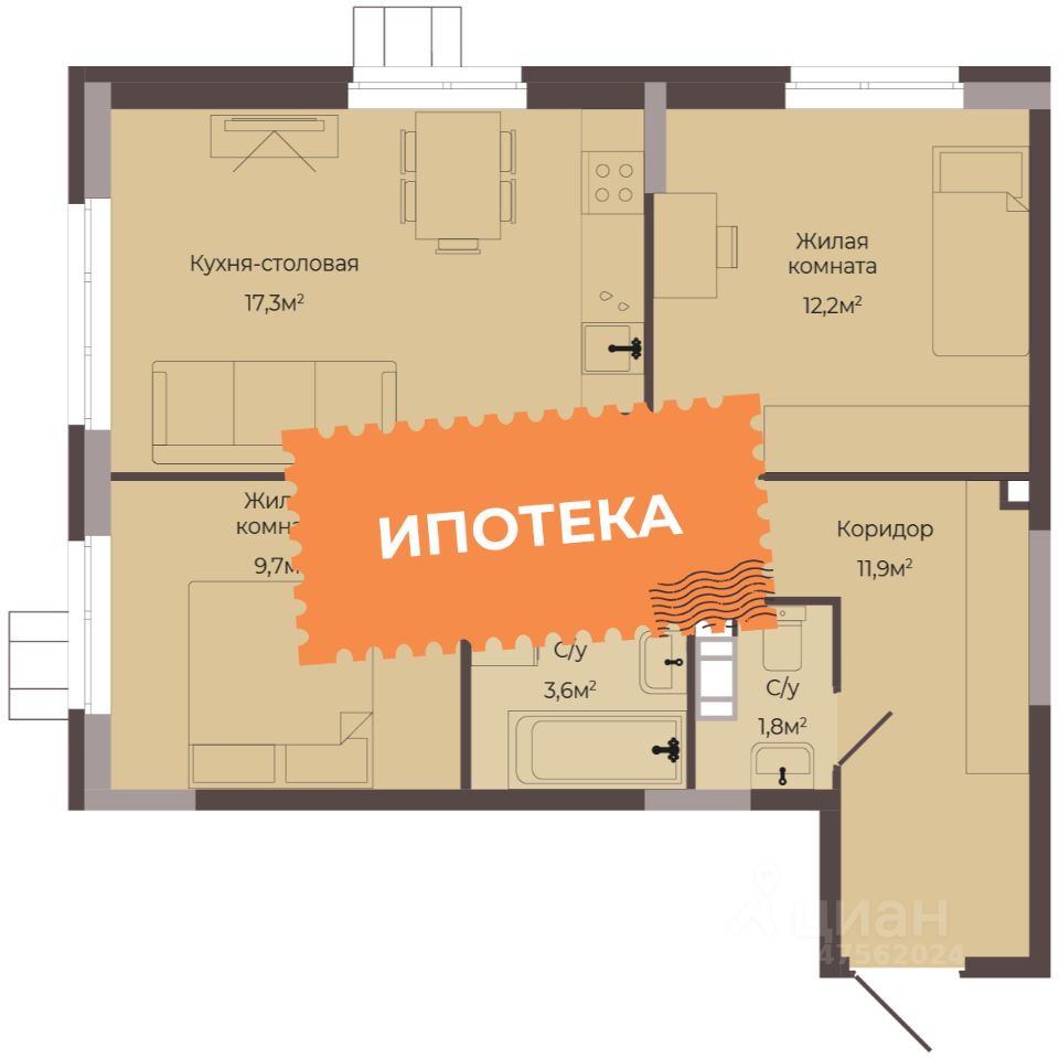 3-комнатная квартира — продуманная планировка для комфортной жизни всей семьи Умная организация пространства: •62,2 м² общей площади с рациональной планировкой •2 отдельных санузла — удобство для всех членов семьи Чем хороша такая планировка: Четкое зонирование — грязная зона отделена при входе Окна на 2 стороны света + 2 окна в кухне-гостиной — обилие естественного света 2 корзины для кондиционера — готовые решения для климатической техники Тёплая лоджия — дополнительное полезное пространство Окна во двор — тишина и приватность Встроенные ниши под шкафы в холле и спальне — экономия пространства Преимущества для жизни: Двор без машин — безопасные прогулки с детьми Солнце весь день благодаря двусторонней ориентации 2 санузла — утренние сборы без очередей Готовая инфраструктура в шаговой доступности Квартиры с такой продуманной планировкой встречаются редко — успевайте сделать выбор! Это не просто метры — это тщательно продуманное пространство для жизни.