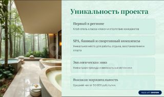 Продаётся готовый инвестиционный проект: Премиальный загородный клуб - отель Зеленый Бор.Мы предлагаем не просто землю, а уникальный актив с беспрецедентными характеристиками в сфере эко-люкс туризма с возможностью мультиформатного использования - 15 га смешанного леса в курортном посёлке Нижнего Новгорода, - Зеленом Городе.Ключевые преимущества для покупателя: Единственный в регионе клуб - отель премиум-класса со SPA, банным и спортивным комплексами отсутствие прямых конкурентов. Проработанный дизайн части проекта (банный комплекс, ресторан, глэмпинг-виллы и т.д.) Земля с высокой добавленной стоимостью участок 15 га в экологически чистой зоне с коммуникациями (получены ТУ на газ, ХВС, канализацию. Электричество подведено - 270 КВт, с возможностью увеличения до 1 МВт, вода в текущий момент - скважина). Высокая маржинальность средний чек от 50 000 руб./сутки, прогнозируемая годовая выручка от 500 млн руб. Монополия в премиум-сегменте отсутствие аналогов в регионе. Проверенная бизнес-модель аналогичные проекты в других регионах показывают доходность от 30% годовых. Минимальные риски спрос на эко-люкс растёт, а предложений почти нет.Уникальность проекта для региона: Первый и единственный клуб-отель такого уровня в радиусе 200 км отсутствие аналогов. Растущий спрос на уединённый премиум-отдых целевая аудитория (состоятельные семьи, блогеры, свадьбы, корпоративы), готовы платить за эксклюзив. Выгодное расположение близко к городу, но в глухом лесу идеальный баланс доступности и приватности. Дополнительные источники дохода SPA, ресторан, банный комплекс, конференц- и коворкинг - зоны, спорткомплекс и ивенты, диверсификация рисков.Почему этот проект золотая жила? Феноменальная маржинальностьФинансовые показатели: Срок окупаемости: 3-4 года (при загрузке от 60%). Прогнозируемая чистая прибыль после выхода на плановые показатели: от 250 млн руб./год. Возможность дальнейшей перепродажи с прибылью от 40% через 5 лет.Средний чек: от 50 000 руб./суткиПрогнозируемая выручка: от 500 млн руб./год при 60% загрузке. Допдоходы от SPA, ресторана, банного комплекса, глэмпинг-зоны, конференц-зоны, коворкинга и ивентов: +50% к основной выручке.Что входит в продажу? Земельный участок 15,7 га в смешанном (преимущественно сосновом) лесу с коммуникациями. Полный пакет документов на земельный участок и постройки на нем. (Договор аренды ЗУ, собственность на постройки, концепция). Часть архитектурной и дизайн-проектной документации (отель, глэмпинг-виллы, SPA-центр, банный комплекс, ресторан). Маркетинговые наработки аудитория, партнёрские соглашения, стратегия продвижения.Почему это выгодно? Монополия в премиум-сегменте эко-туризма Быстрый старт возможная реконструкция существующих объектов для запуска проекта. Капитализация земельного актива +10-15% ежегодно Проверенная доходность аналоги приносят 30-35% годовых