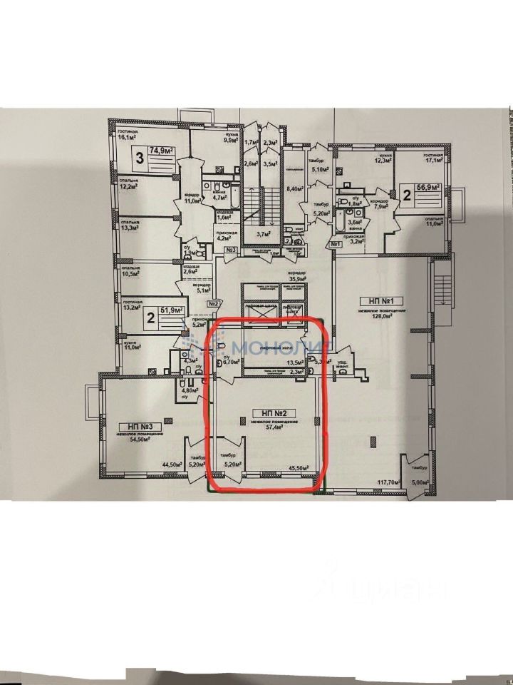 Нежилое помещение заложено с начала постройки дома. Первый этаж 5-этажного кирпичного дома. Площадь 77.4 кв м, из них основной зал 45 кв м, остальное-другая часть помещения с отдельным входом. 2 входа. Потолки 3.5 м. Сигнализация, светодиодное освещение, промышленный кондиционер. Коммунальные платежи оплачиваются отдельно. Мощность 15 квт. Подходит для любого вида деятельности. Только аренда.