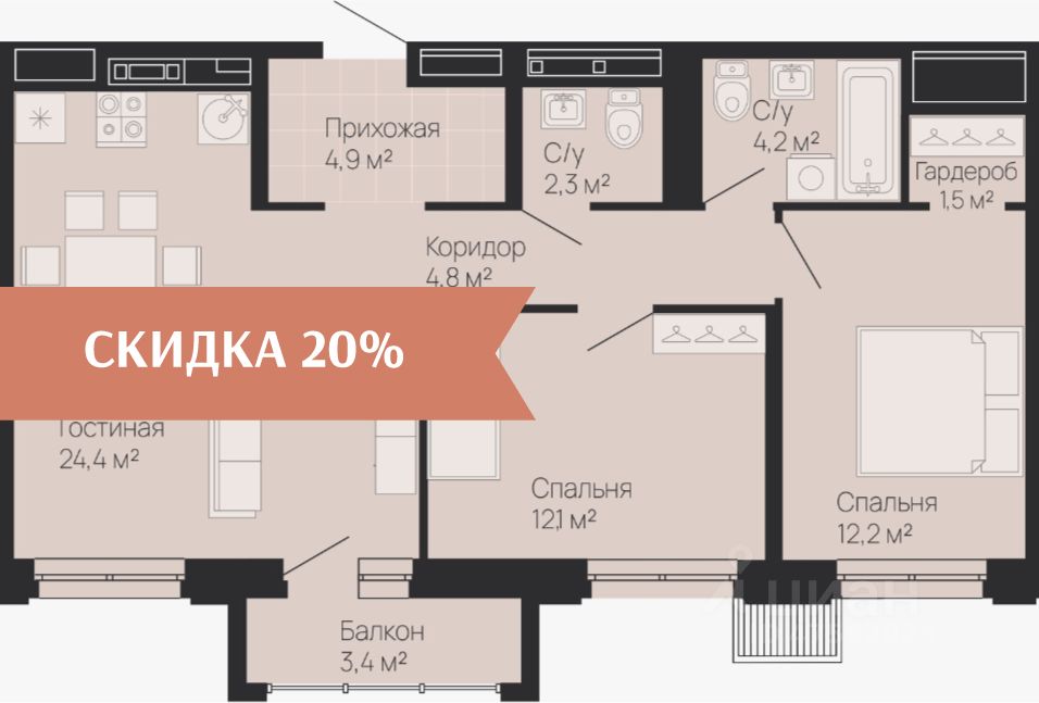 Жилая площадь24,3 м2