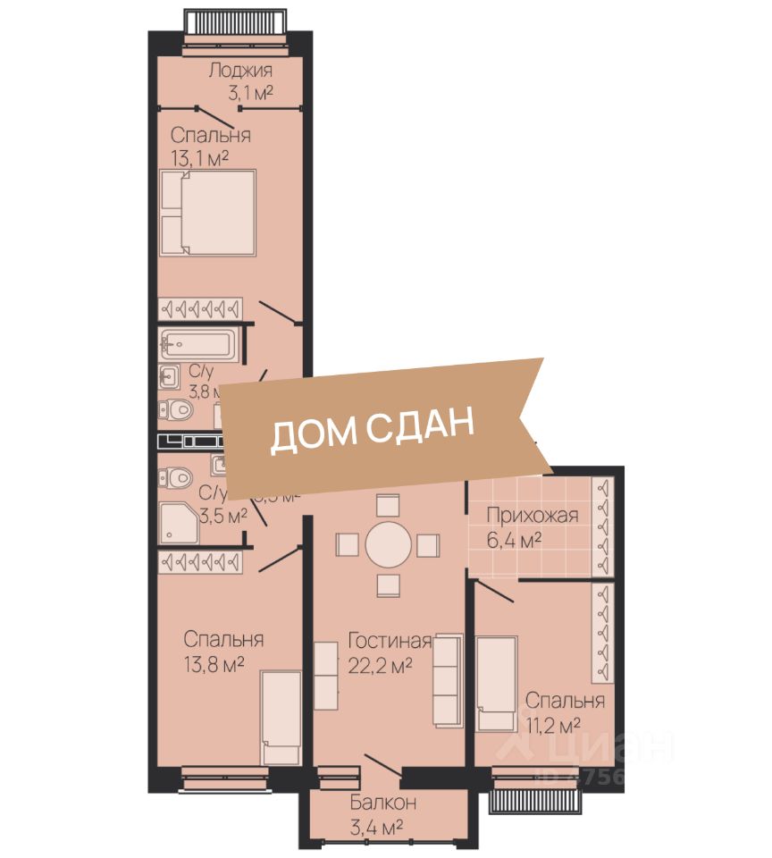 Жилая площадь38,1 м2