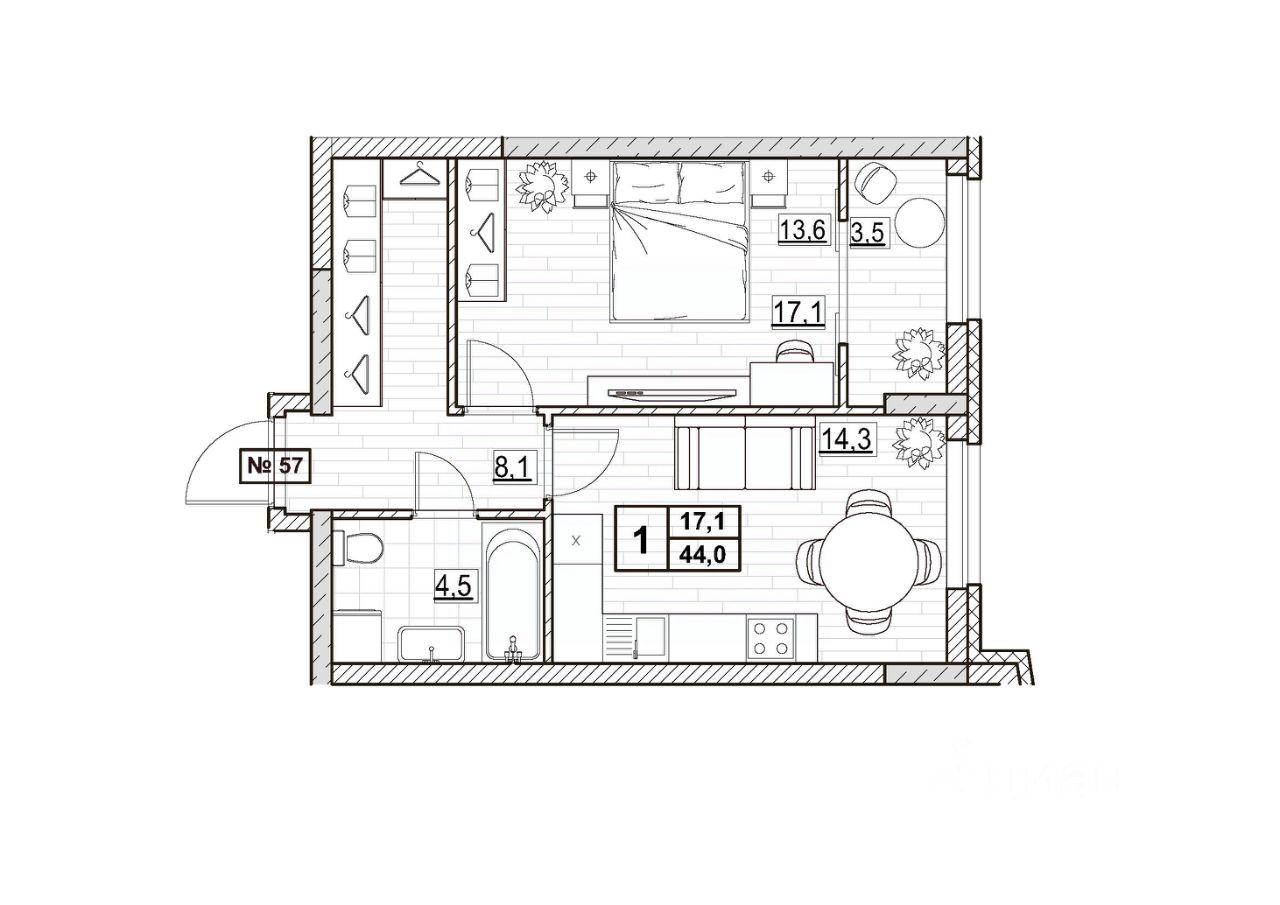 Общая площадь44 м2