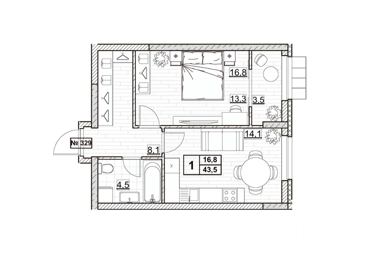 Общая площадь43,5 м2