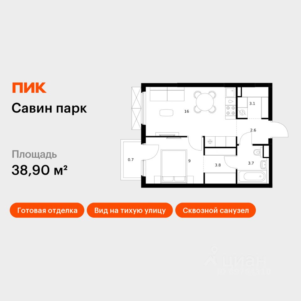 Продаётся 1-комн. квартира площадью 38,9 кв.м на 25 этаже 25 этажного дома (Корпус 10, Секция 1) проекта ПИК Савин парк. Светлый просторный подъезд на уровне земли, функциональная планировка, большие окна, c отделкой.