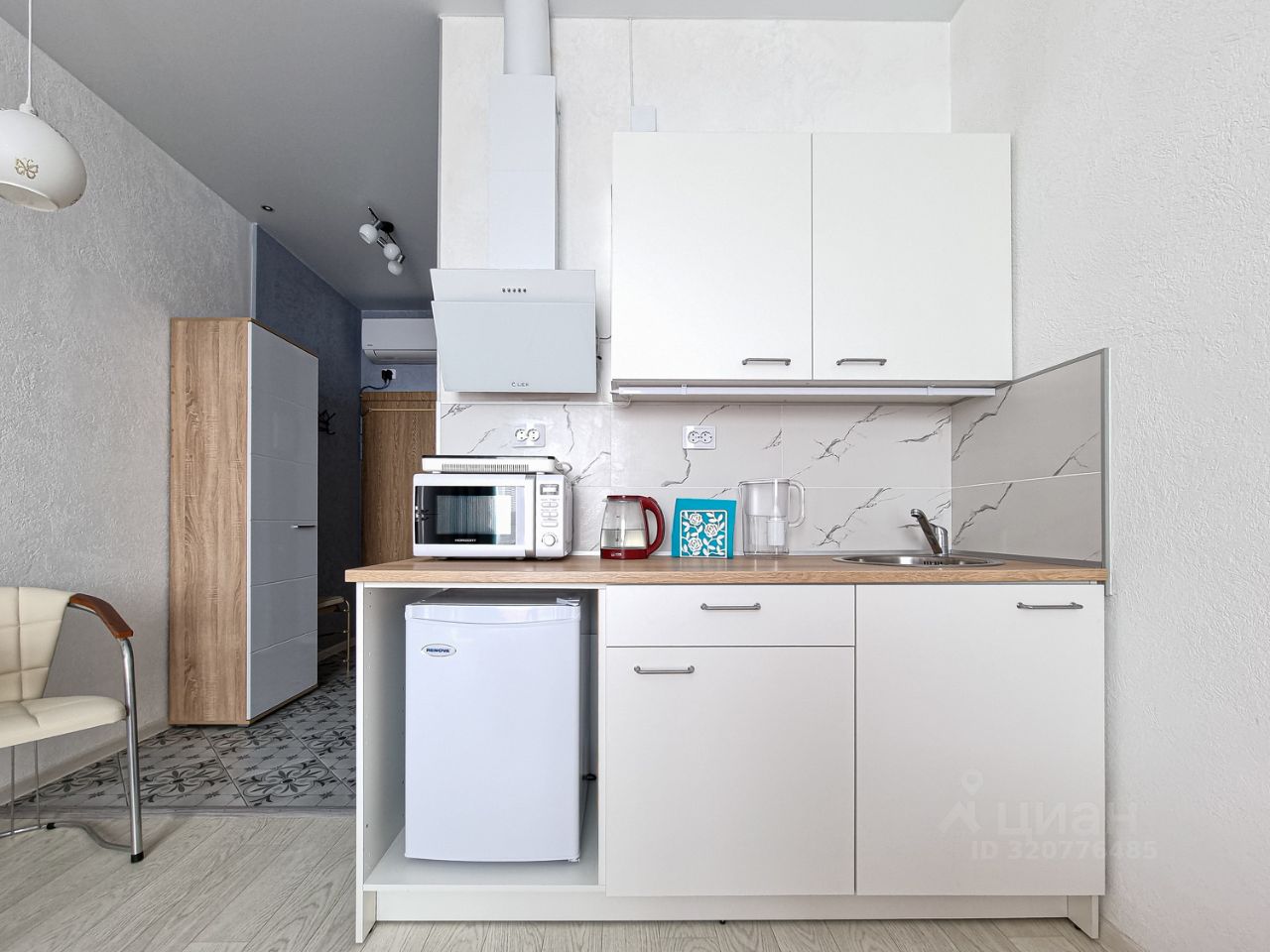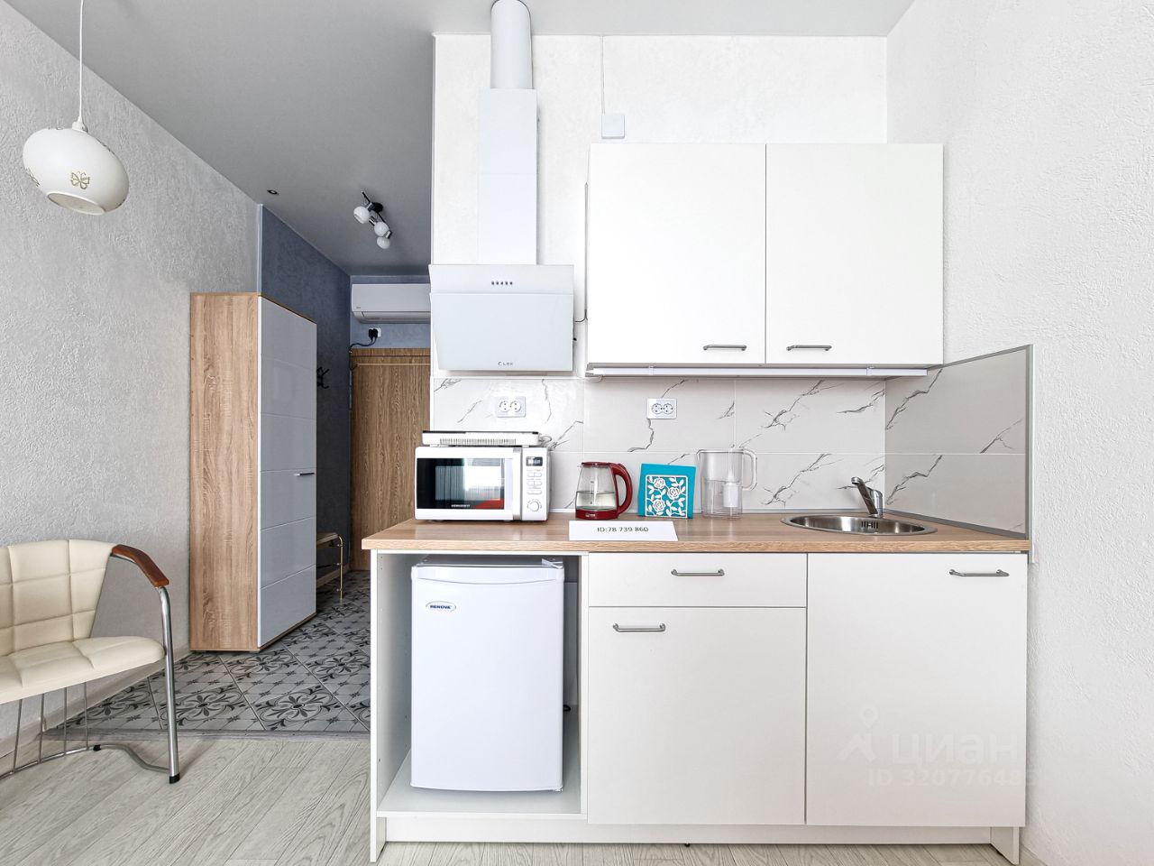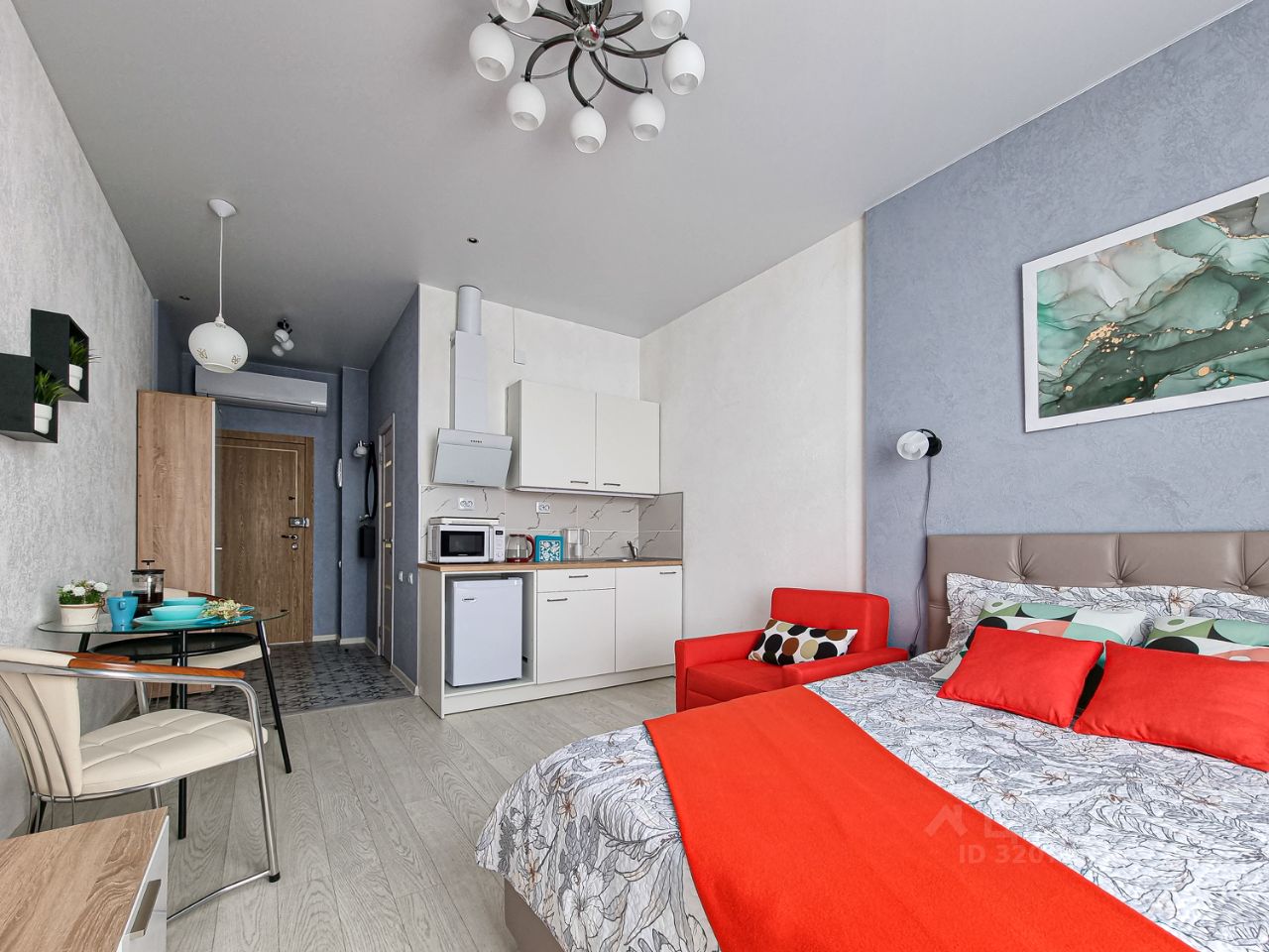 Полностью оборудованная кухня: холодильник, индукционная плита, микроволновая печь, полный комплект посуды, чайник, фильтр для воды, ж/к телевизор, утюг, фен, бесплатный Вайфай, кондиционер, стиральная машина ,гладильная и сушильная доски, пылесос.