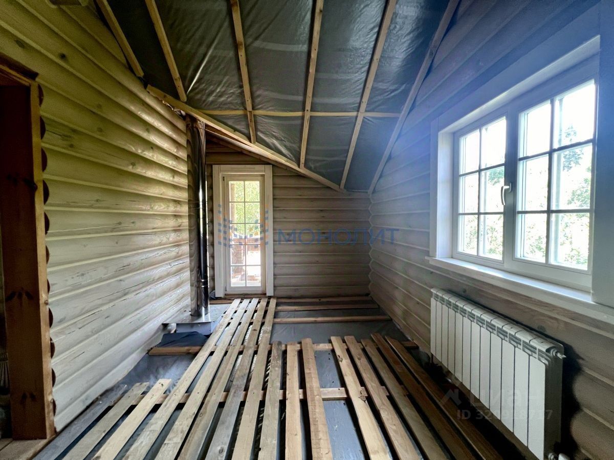 На первом этаже кухня-гостиная и дровяная баня с помывочным отделением. На втором этаже 3 спальные комнаты.