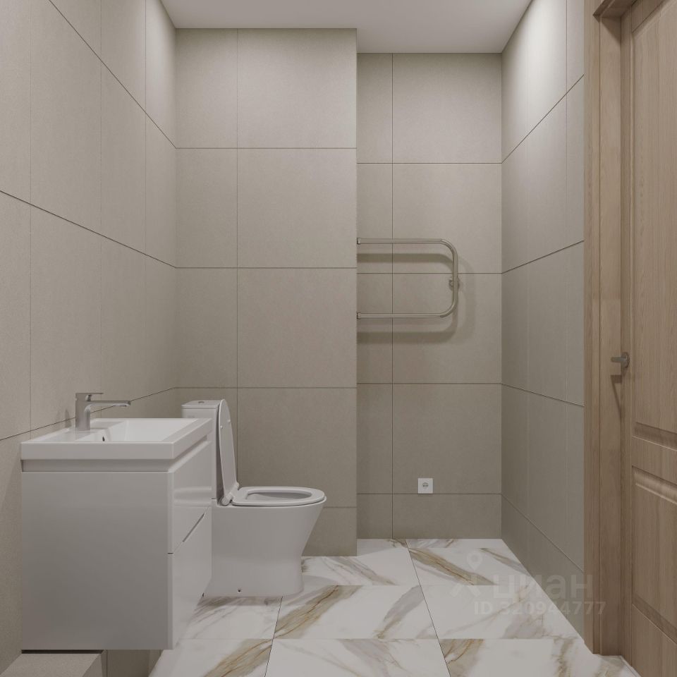 Ванная комната подвесная раковина с тумбой белоснежная акриловая ванна электрический полотенцесушитель удобный унитаз-компакт стены — бежевая плитка, пол — керамогранит под мрамор споты на потолке Кухня светлый кухонный гарнитур встроенные духовой шкаф и варочная панель раковина и смеситель уже установлены На полу ламинат 32 класса Комнаты белые обои под покраску — легко освежить интерьер в любом стиле надёжный ламинат 32 класса на полу шпонированные межкомнатные двери Прихожая износостойкий керамогранит под мрамор, который всегда выглядит аккуратно и стильно.
