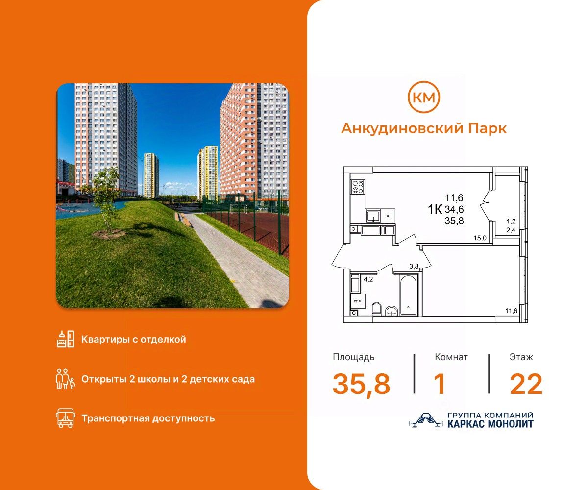 КМ Анкудиновский Парк — современный жилой комплекс, который уже стал полноценным районом для жизни. Здесь не нужно ждать, пока появится инфраструктура — всё уже есть и работает! Открыты 2 детских сада на 150 и 280 мест, 2 школы на 1350 местСетевые магазины, кафе и различные сервисыИгровые и спортивные площадки для детей и взрослыхПроектом предусмотрено строительство третьего детского сада, а также торгового центра, поликлиники и ФОКаОбщественный транспорт: несколько действующих маршрутов, на которых удобно добираться в разные части города Станьте жителем КМ Анкудиновский Парк и вы! Посетите наш шоурум и узнайте больше о выгодных предложениях и вариантах покупки в офисе продаж группы компаний Каркас Монолит.