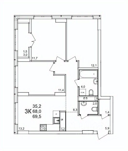 Общая площадь69,5 м2