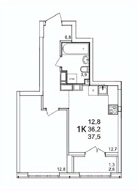 Общая площадь37,5 м2