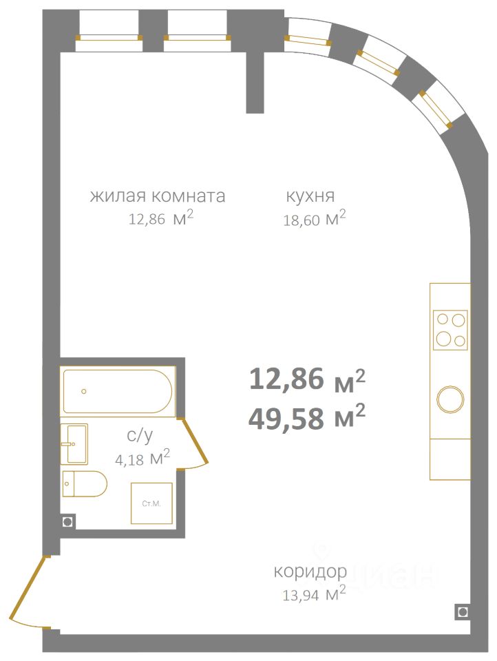 Общая площадь49,58 м2