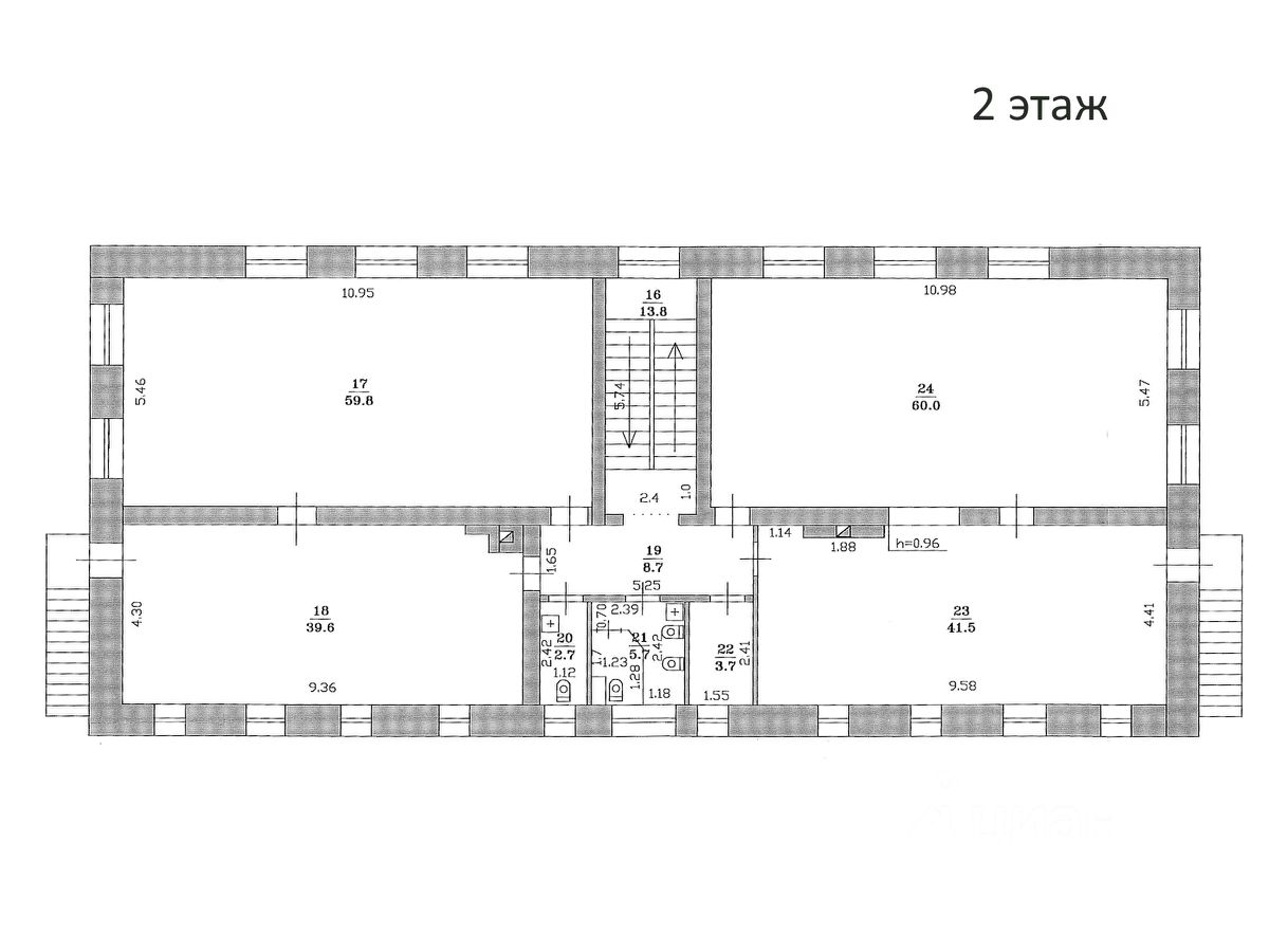 Описание здания: •1 этаж (240,6 м²): Офисная зона на 21 рабочее место, оборудованная кухня и комната для приема пищи, санузлы. •2 этаж (235,5 м²): Офисная зона на 40 рабочих мест (4 просторных кабинета), санузлы. •Цокольный этаж (59,4 м²): Зал для совещаний и кабинет директора.