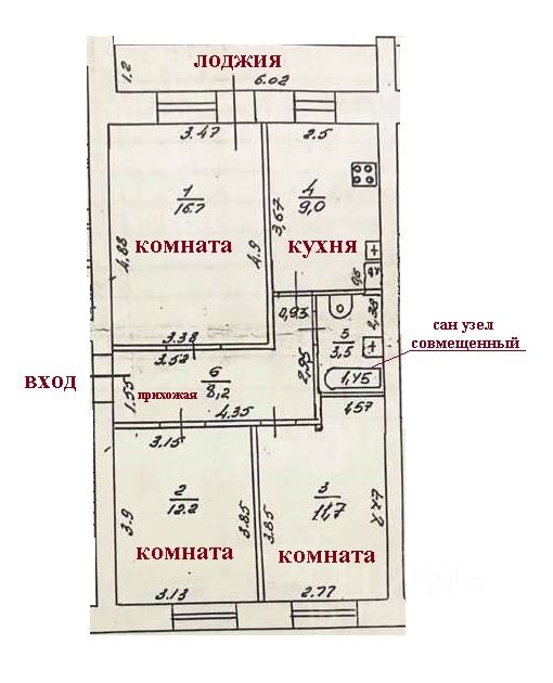 Основные характеристики: •Общая площадь с учетом лоджии 65,2 кв.м •Общая площадь по Росреестру 61,2 кв.м •Жилая площадь 40,6 кв.м •Просторная кухня 9 кв.м., •Комнаты изолированные 11,7+12,2+16,7 кв.м. •Широкая лоджия на зал и кухню застеклена. •Сан. узел совмещенный. •Перепланировка узаконена.