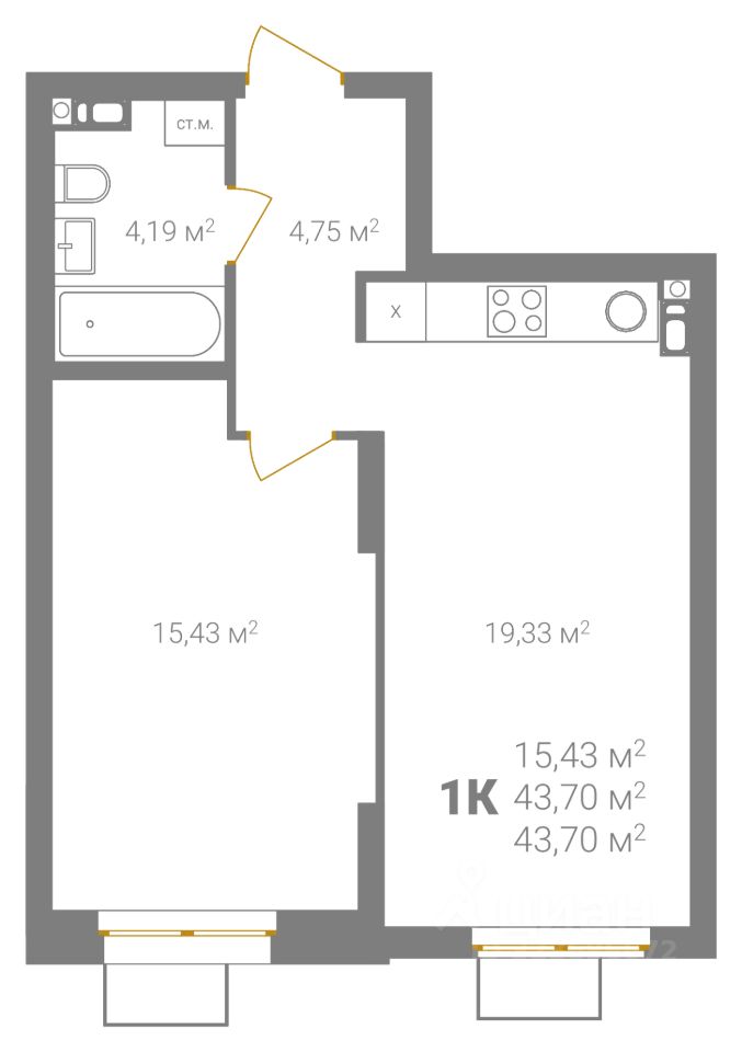 Общая площадь43,7 м2