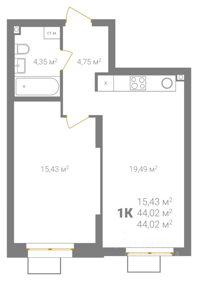 Общая площадь44,02 м2