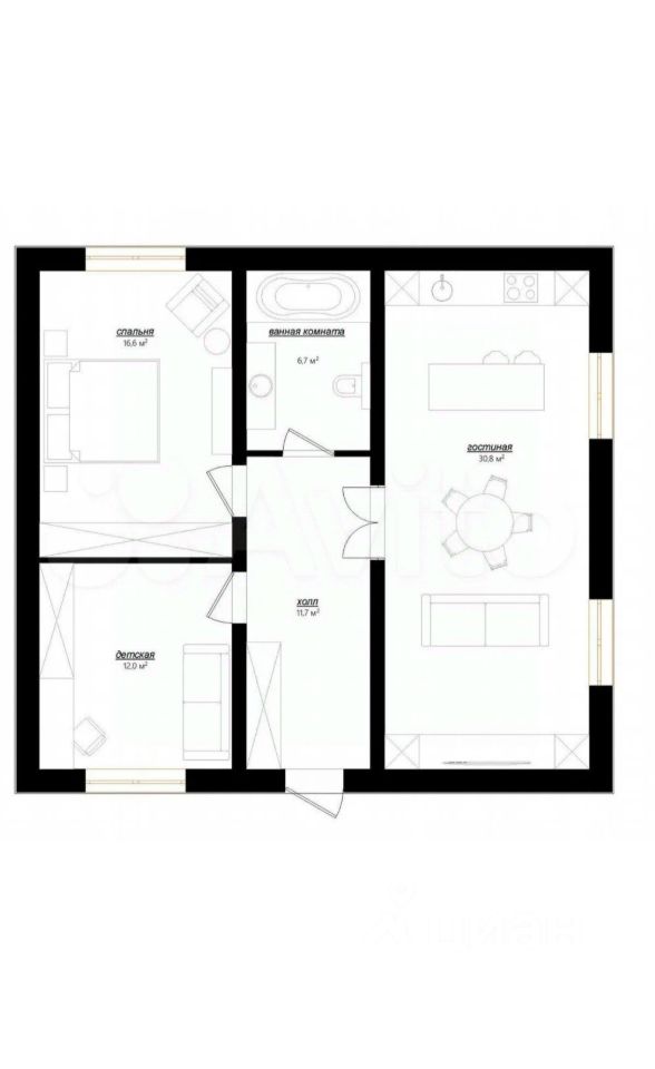 Кухня-гостиная, с/у, 2 комнаты.