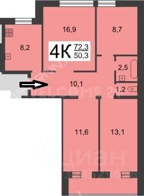 Общая площадь 72,5м (+большая лоджия 4,9м ).