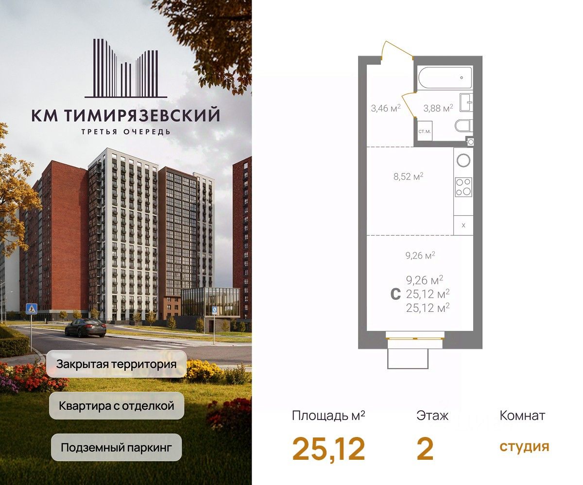 Фасады из керамического кирпича — надёжно и стильно Закрытый двор без машин — безопасность и уют Благоустройство продуманная территория для детей и взрослых Подземный паркинг — два уровня, лифт в жилую часть Коммерческие помещения на 1 этаже — магазины и сервисы рядом Все квартиры с готовой отделкой До 4 квартир в обособленном холле. КМ Тимирязевский. 3 очередь — ваш новый уровень комфорта.
