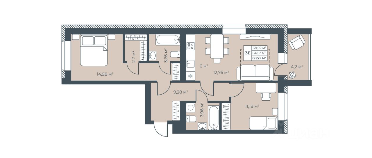 Продаётся 3-комнатная квартира в строящемся доме (Дом 2), срок сдачи: III-кв. 2027, общей площадью 68.72 кв.м., на 3 этаже. Новый жилой комплекс ''Ботаника Парк'' от застройщика ''БМ Групп'' расположен по адресу Россия, Нижегородская область, Выкса, квартал Инженера Шухова.