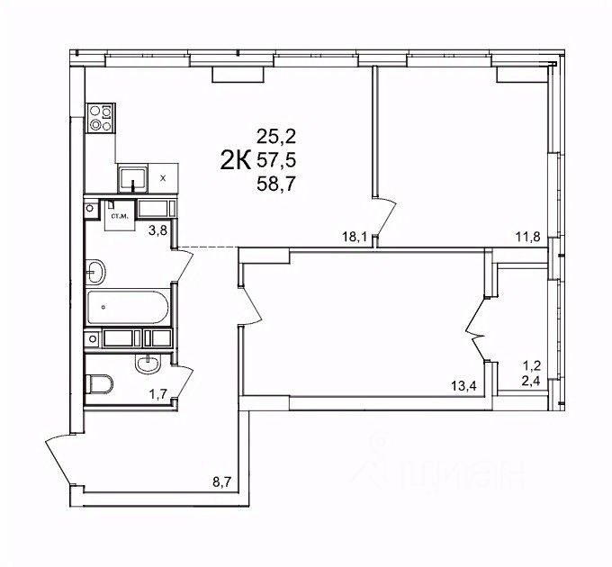 Общая площадь58,7 м2