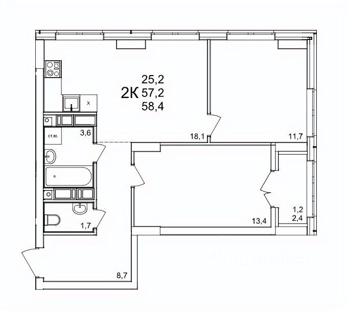 Общая площадь58,4 м2