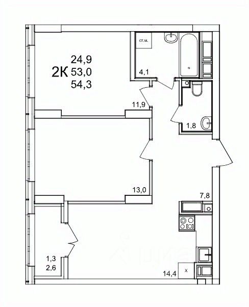Общая площадь54,3 м2