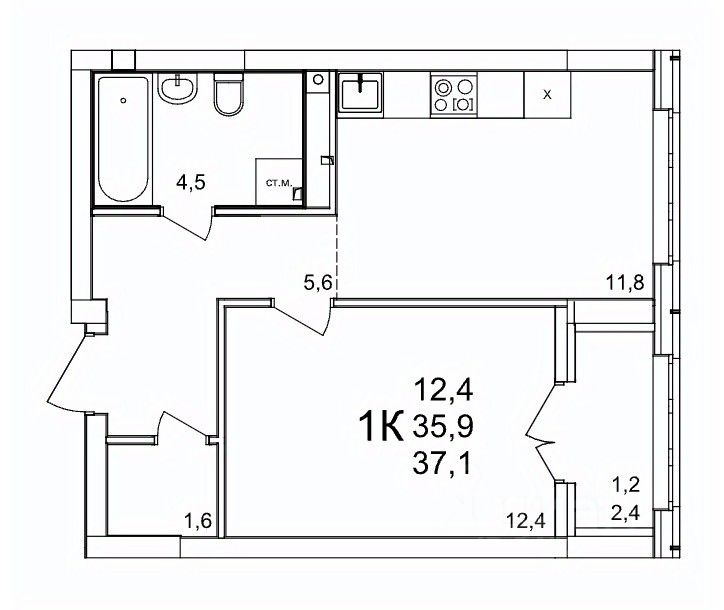 Общая площадь37,1 м2