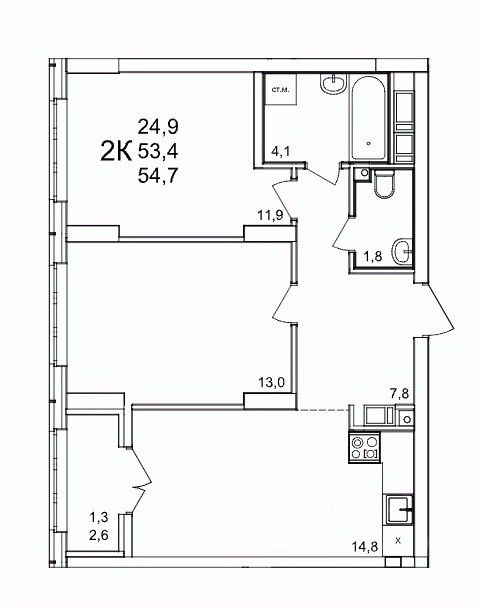 Общая площадь54,7 м2