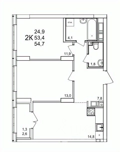 Общая площадь54,7 м2