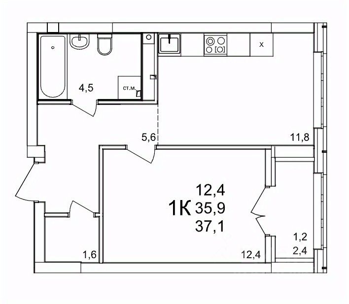 Общая площадь37,1 м2
