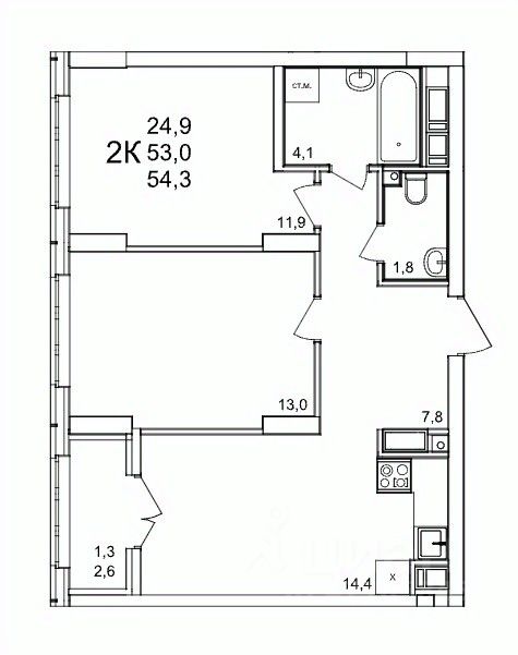Общая площадь54,3 м2
