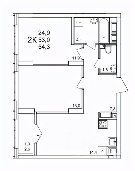Общая площадь54,3 м2