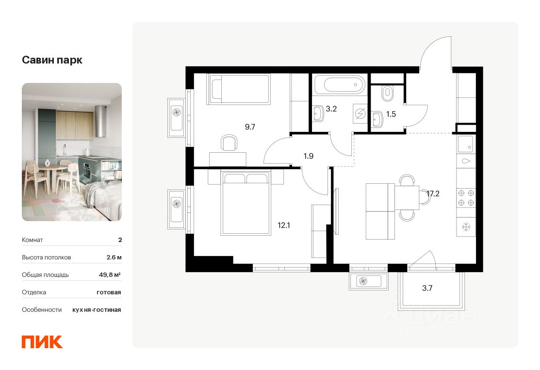 Продаётся 2-комн. квартира площадью 49,8 кв.м на 12 этаже 17 этажного дома (Корпус 7, Секция 1) проекта ПИК Савин парк. Светлый просторный подъезд на уровне земли, функциональная планировка, большие окна, c отделкой.