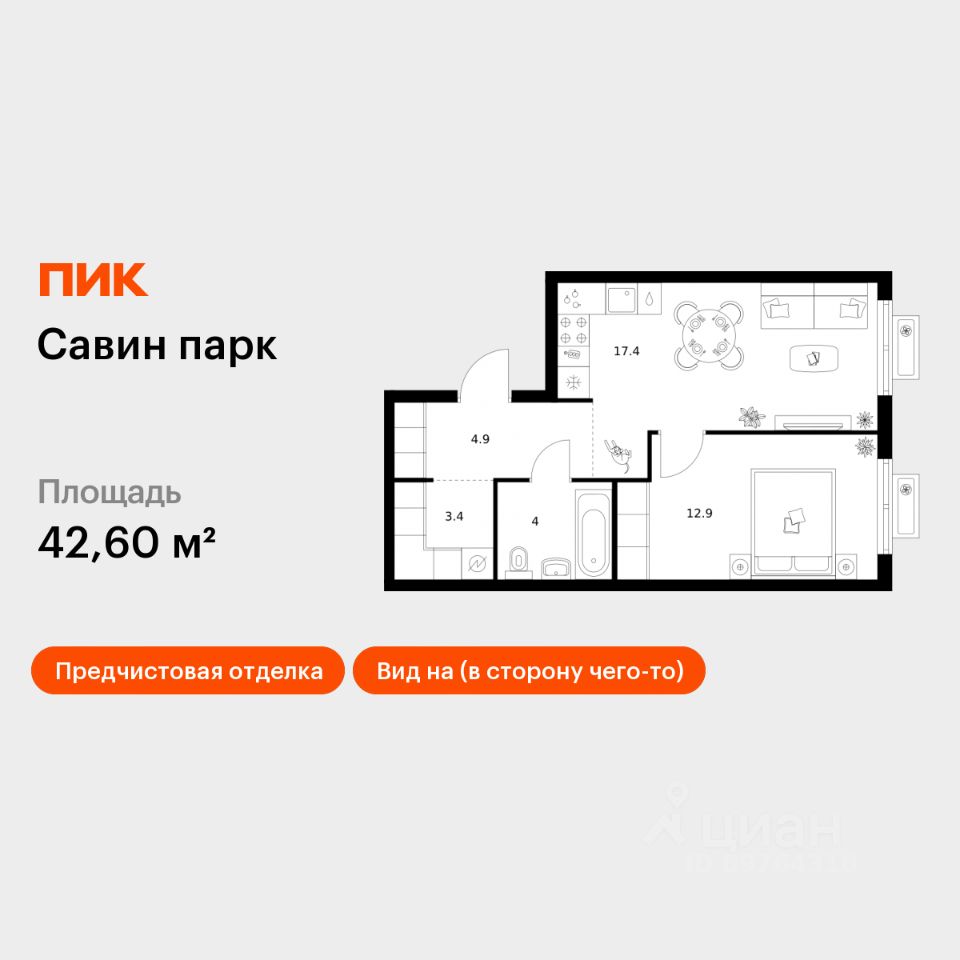 Продаётся 1-комн. квартира площадью 42,6 кв.м на 4 этаже 17 этажного дома (Корпус 9, Секция 1) проекта ПИК Савин парк. Светлый просторный подъезд на уровне земли, функциональная планировка, большие окна, предчистовая отделка.