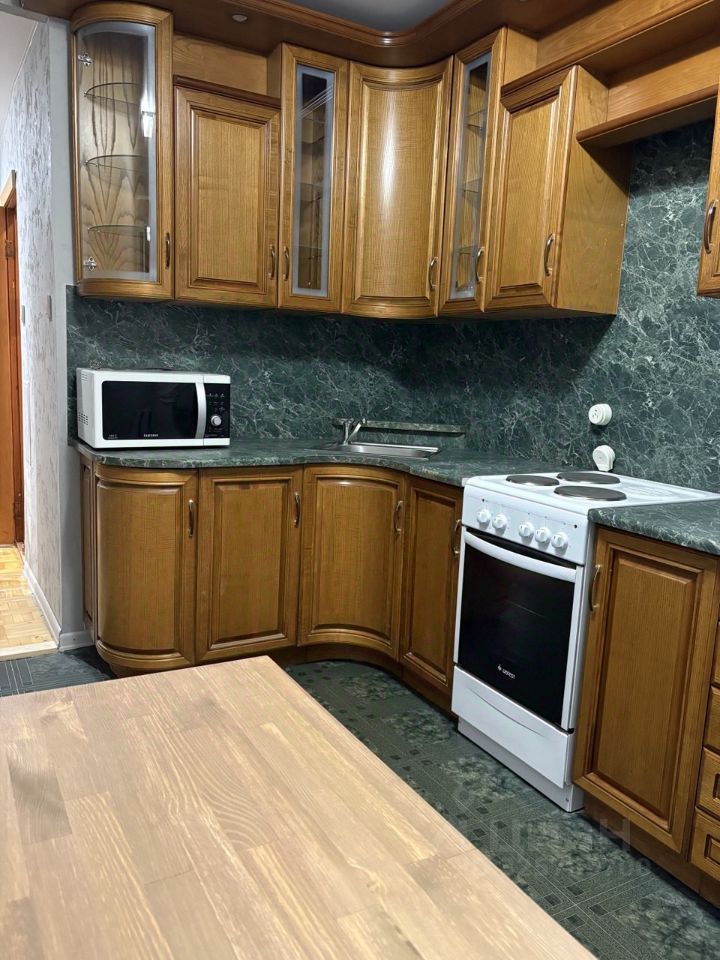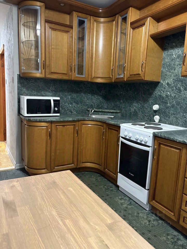 В квартире есть удобный кухонный гарнитур, новый шкаф для вещей, двуспальная кровать, холодильник, новая электроплита, стиральная машина, микроволновка.