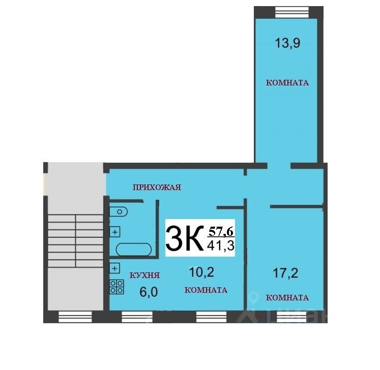 Основные характеристики: •Общая площадь по Росреестру 57,6 кв.м •Жилая площадь 41,3 кв.м •Кухня 6 кв.м., •Комнаты изолированные. •Сан. узел совмещенный.