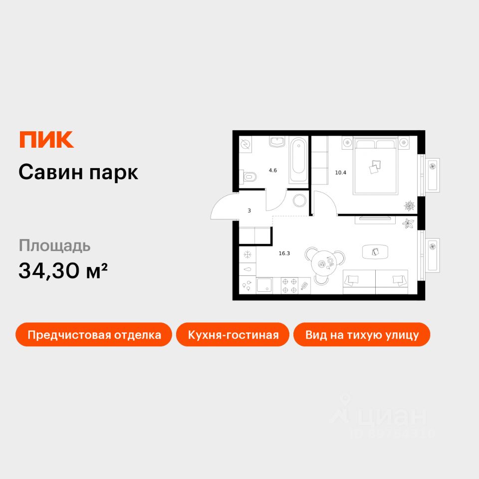 Продаётся 1-комн. квартира площадью 34,3 кв.м на 6 этаже 17 этажного дома (Корпус 9, Секция 1) проекта ПИК Савин парк. Светлый просторный подъезд на уровне земли, функциональная планировка, большие окна, предчистовая отделка.