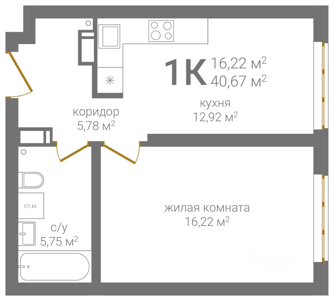 Общая площадь40,67 м2