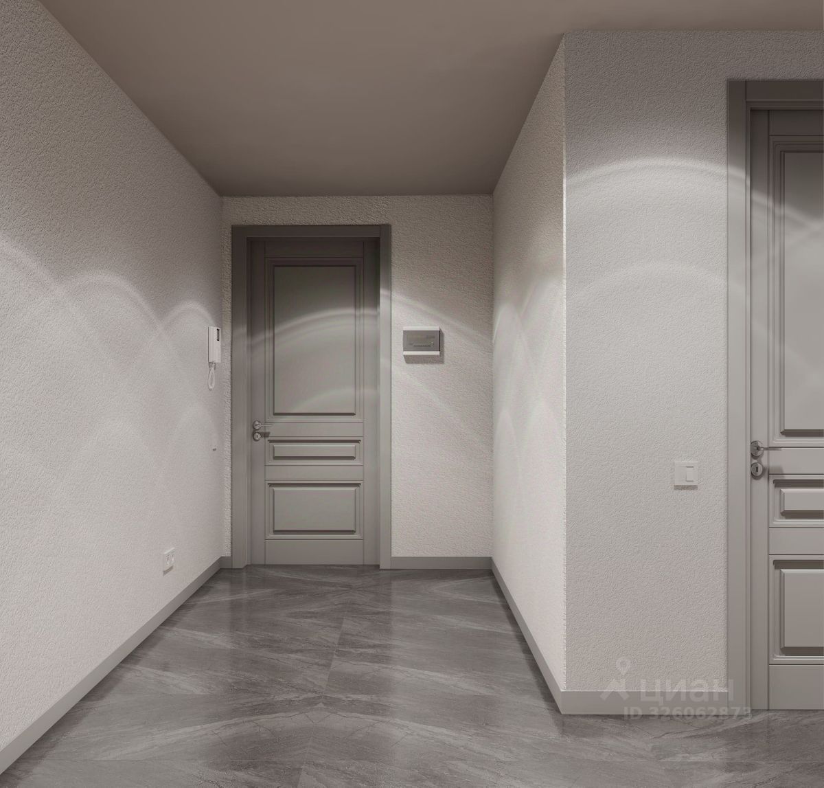 Крупноформатный глянцевый керамогранит на полу Белоснежные флизелиновые обои под покраску Надежная входная металлическая дверь высотой 2,4 м