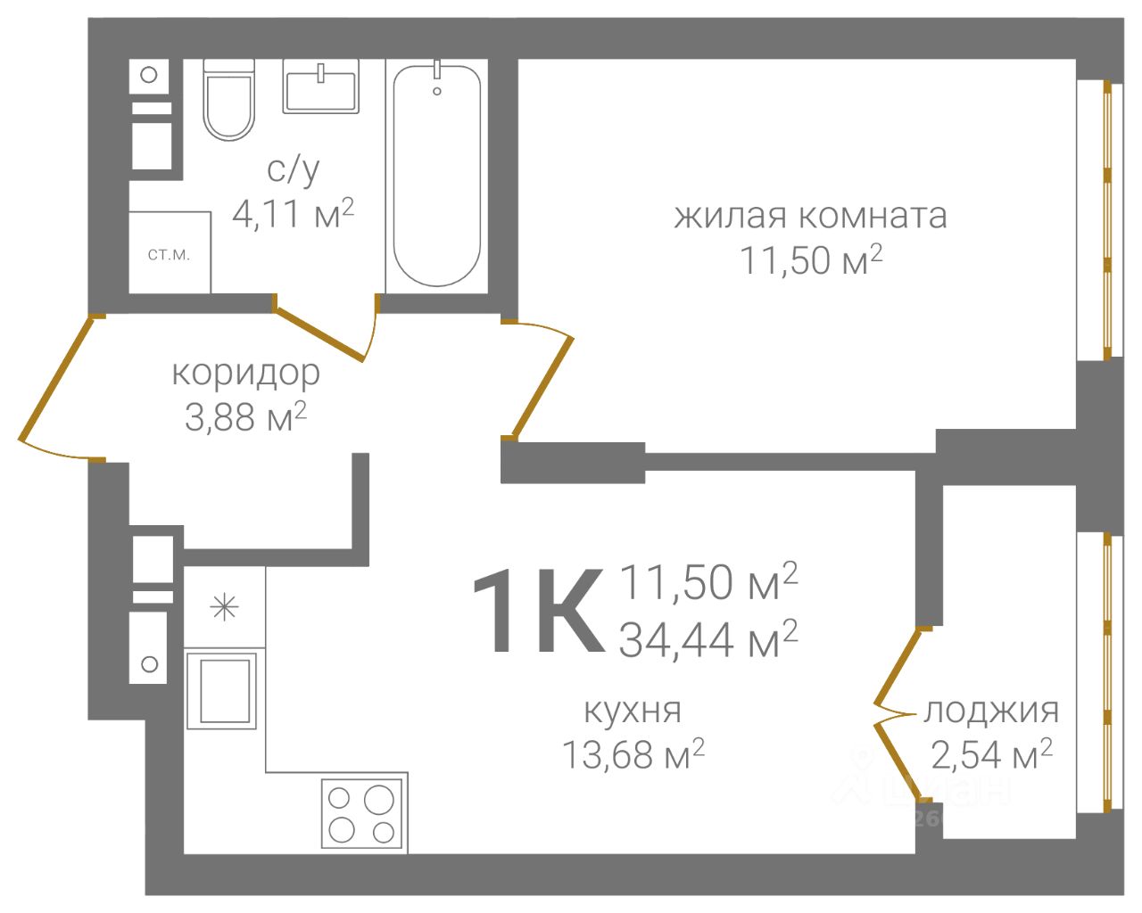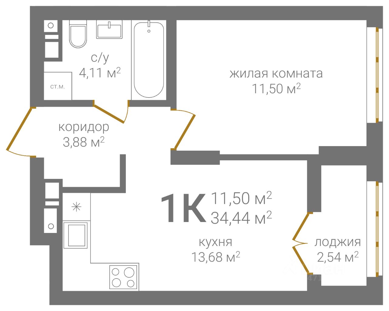 Общая площадь34,44 м2