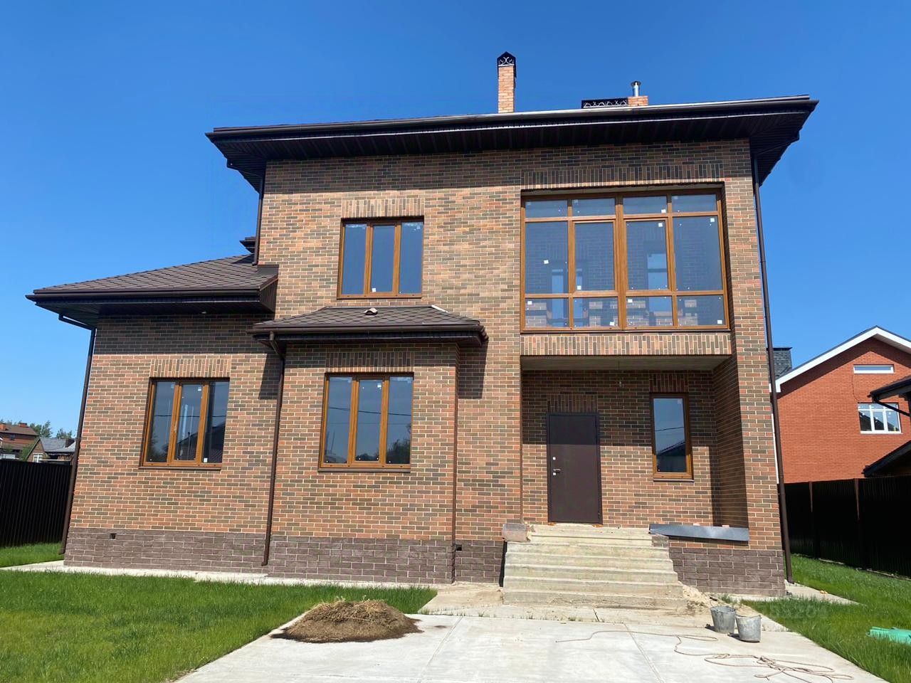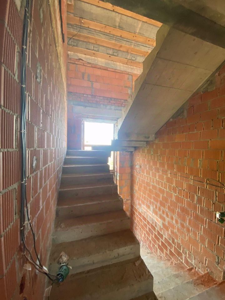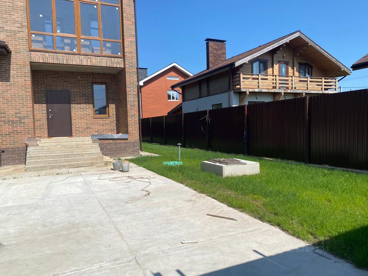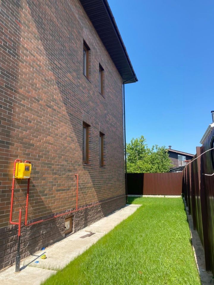 Дом кирпичный , 3 этажа ( 3- мансардный), газ подведен, канализация - септик, вода - скважина , электричество - разводка сделана. Парковка перед воротами на улице на 2-3 машины забетонирована, ворота откатные на пульте. Газон.