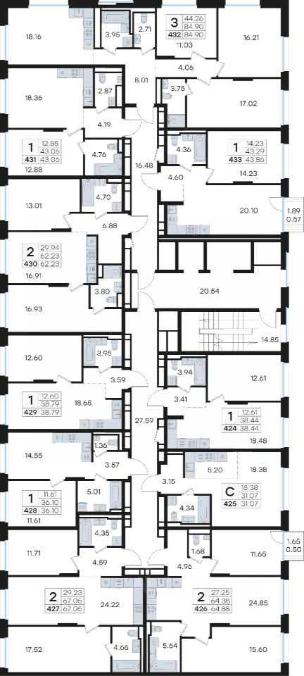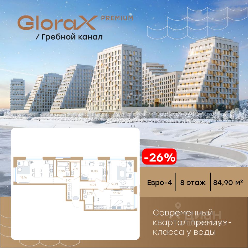 Продается 3-комн. квартира на 8-м этаже в строящемся проекте премиум-класса GloraX Premium Гребной канал. Общая площадь лота составляет 84,90 кв. м, из которых 44,26 кв. м отведено под жилую и 18,16 кв. м под кухонную зону. Номер квартиры - 432.