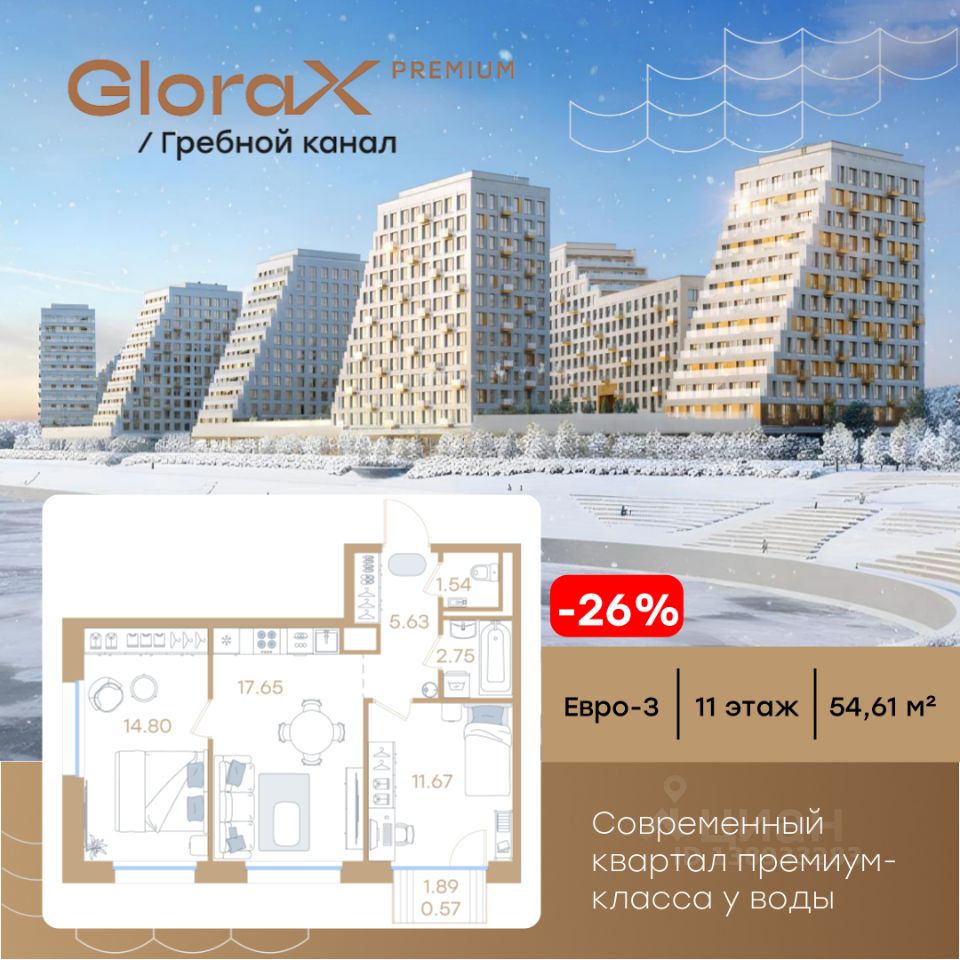 Продается 2-комн. квартира на 11-м этаже в строящемся проекте премиум-класса GloraX Premium Гребной канал. Общая площадь лота составляет 54,61 кв. м, из которых 26,47 кв. м отведено под жилую и 17,65 кв. м под кухонную зону. Номер квартиры - 105.