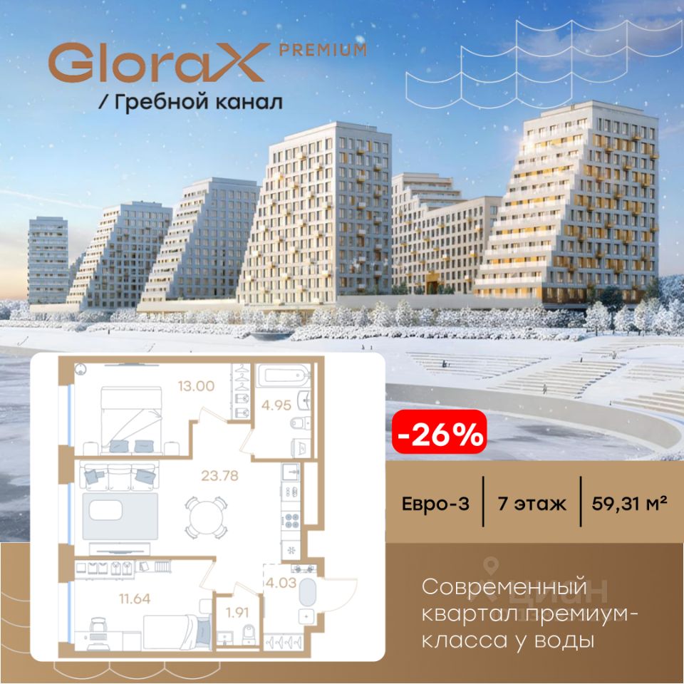 Продается 2-комн. квартира на 7-м этаже в строящемся проекте премиум-класса GloraX Premium Гребной канал. Общая площадь лота составляет 59,31 кв. м, из которых 24,64 кв. м отведено под жилую и 23,78 кв. м под кухонную зону. Номер квартиры - 509.